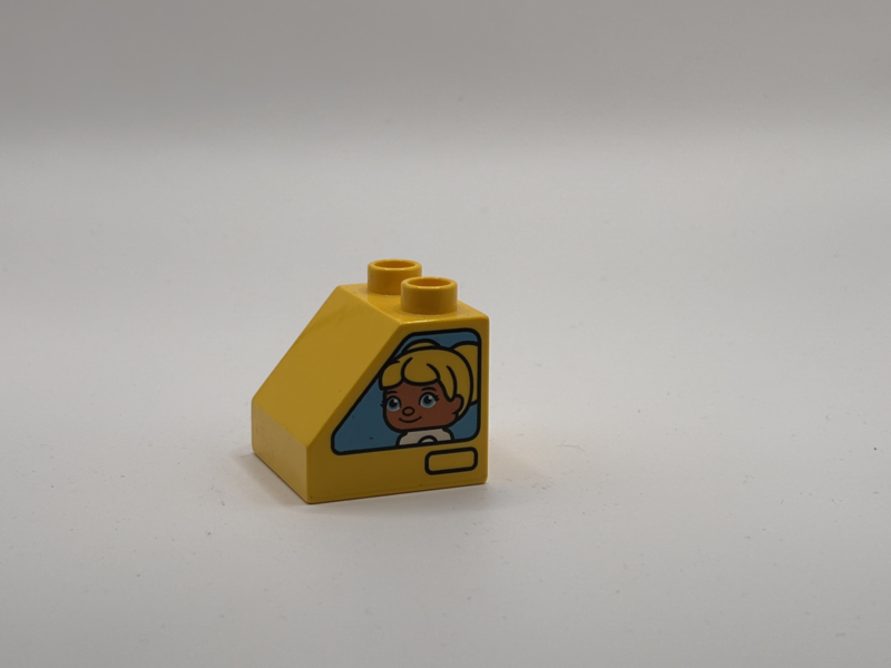 Poppetje creatieve auto’s op schuin blok geel Duplo