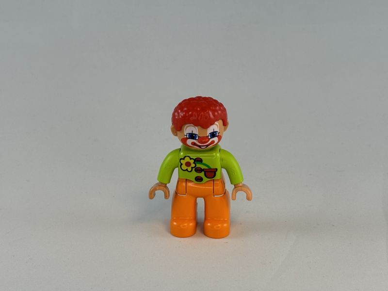 Duplo clown licht blauwe broek, rood shirt met gele mouwen en groene krullen
