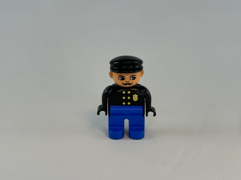 Duplo politieagent met snor blauwe broek, zwarte jas met gouden badge