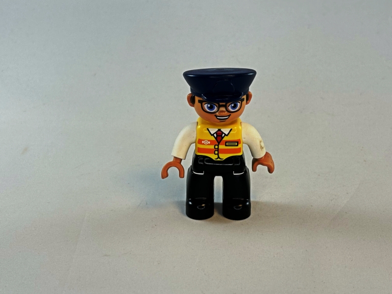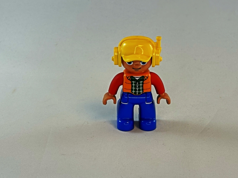 Duplo machinist met geel hesje, wit shirt en bril