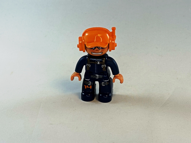 Duplo piloot blauwgrijze pak en oranje helm