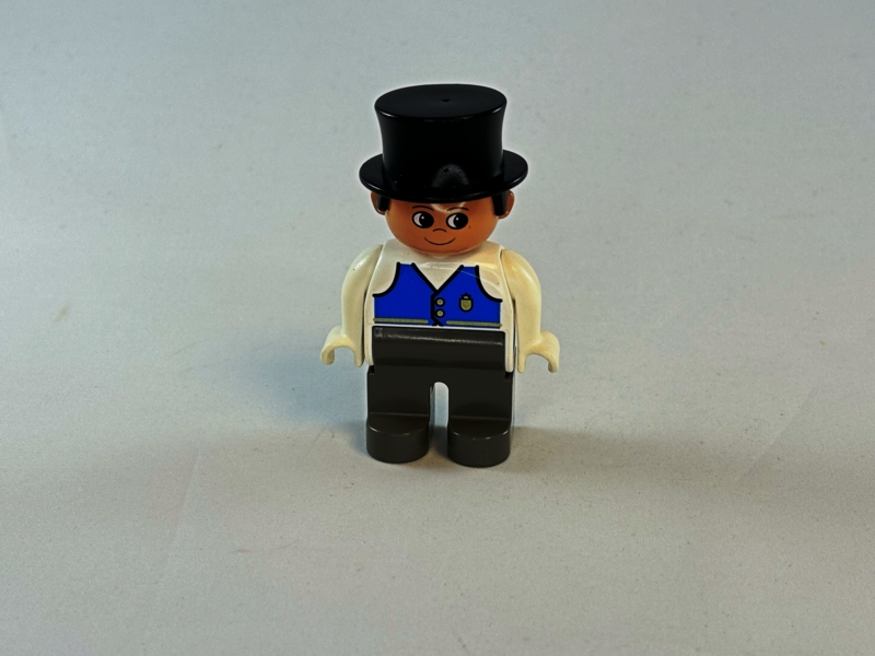 Duplo koetsier met blauw en wit shirt en hoge hoed